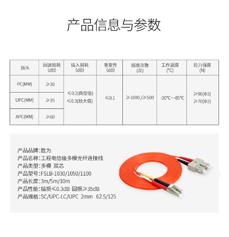 商品名称:☆胜为 SHENGWEI FSLB-1050 工程电信级光纤跳线 SC(UPC)-LC(UPC)多模双芯 5米