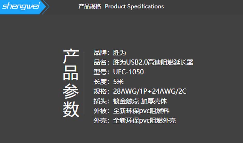 商品名称:☆胜为 SHENGWEI UEC-1050 工程级阻燃 USB2.0延长器 5米 带信号放大器 USB延长线 加强芯片摄像头连接线