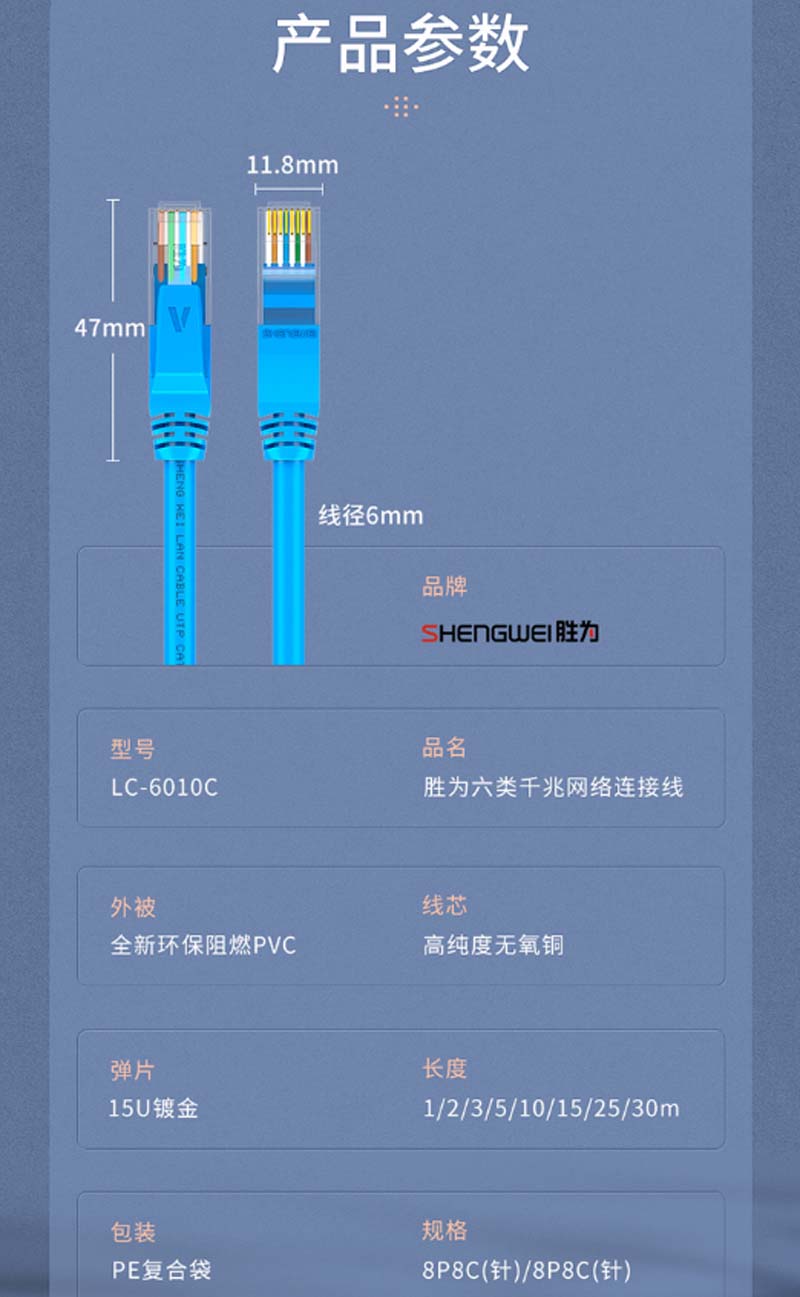 商品名称:☆胜为 SHENGWEI LC-6050C 六类网线 纯铜千兆8芯双绞网络跳线 5米 蓝色 无氧铜高速网络连接线 千兆网线