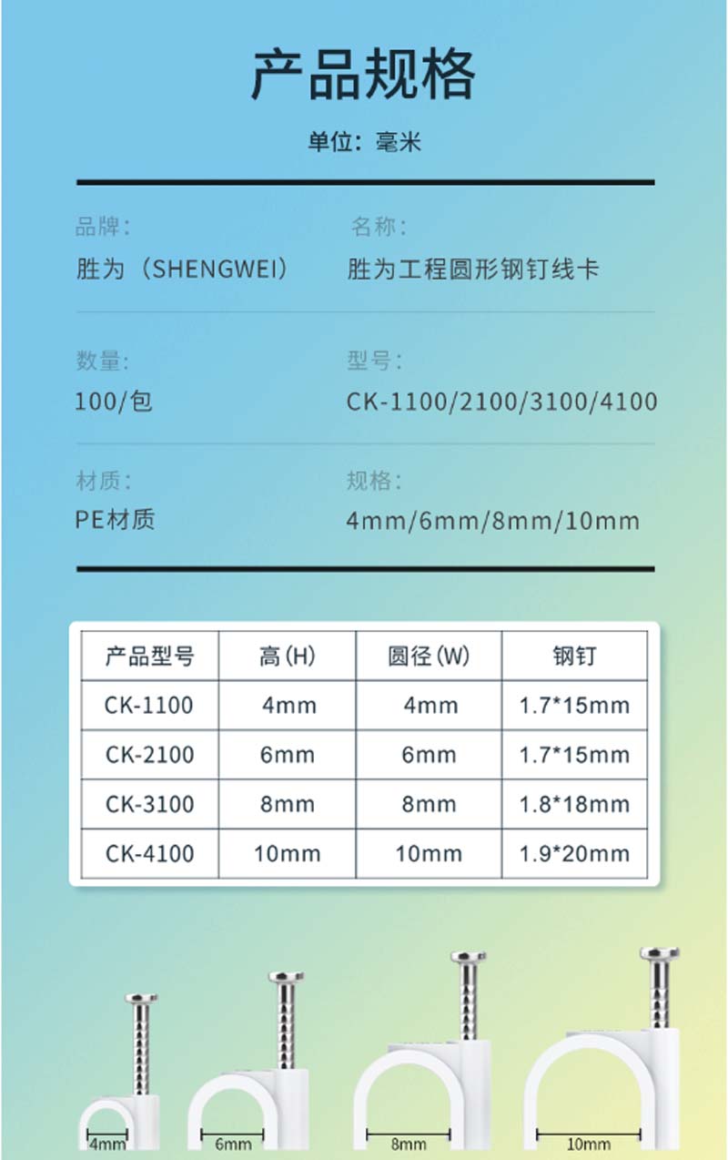 商品名称:☆胜为 SHENGWEI CK-3100 工程圆形钢钉线卡 8MM 100个/包