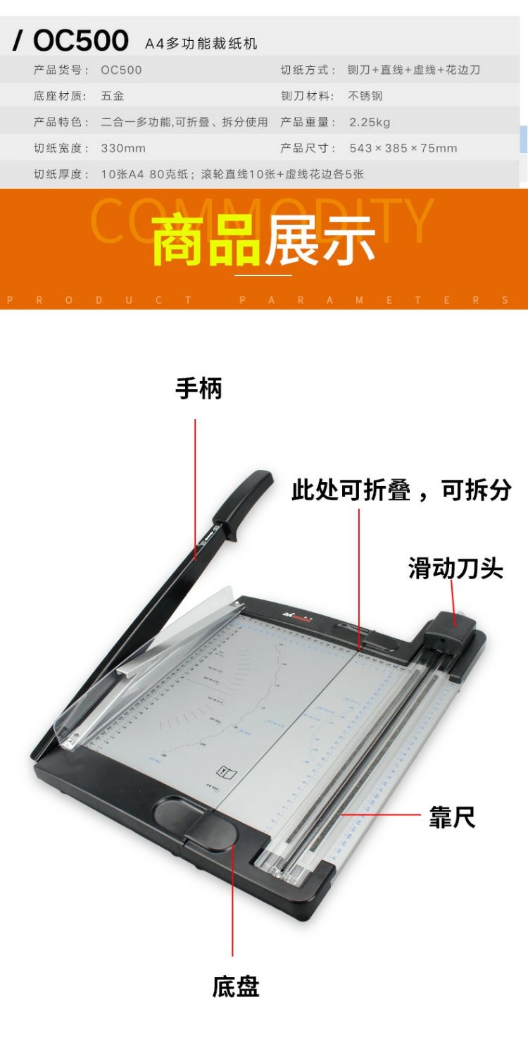 商品名称:☆众叶 SOONYE 切纸刀 A4家用裁纸刀 手动照片裁切刀 相片铡刀 裁剪器刀切纸 OC500