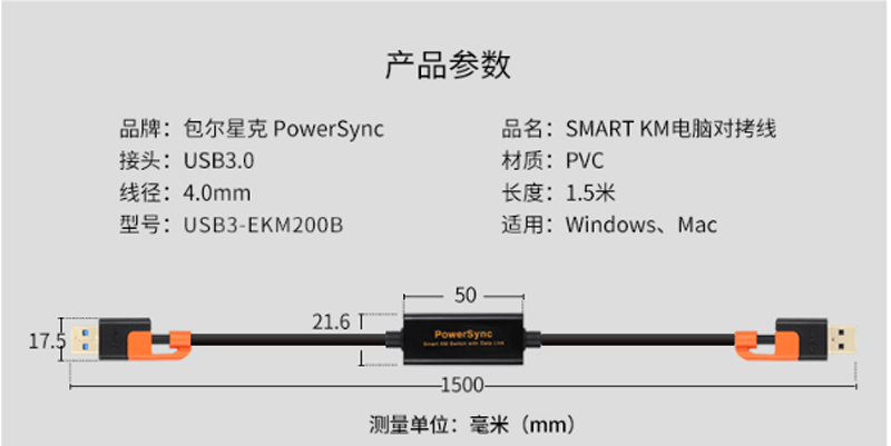 商品名称:☆包尔星克 USB3-EKM200B USB3.0多功能资料对拷线对传线 1.5米 黑配橘