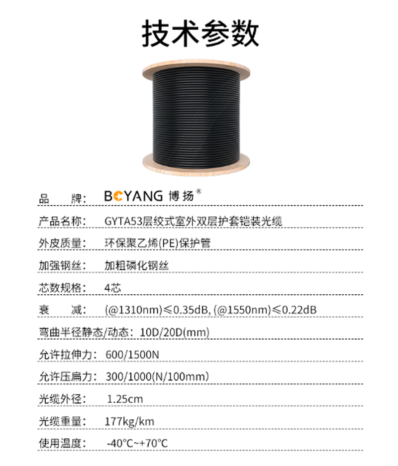 商品名称:☆博扬 BOYANG BY-GYTA53-24B1.3 24芯单模室外光缆 GYTA53层绞式直埋网线光纤线 100米