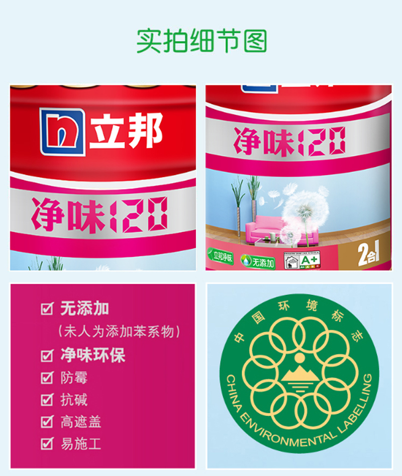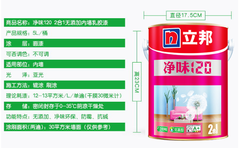 商品名称:☆立邦 净味120二合一无添加油漆涂料内墙乳胶漆墙面漆5L