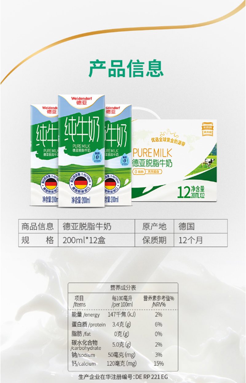 商品名称:德亚(Weidendorf)脱脂纯牛奶 早餐奶 200ml*12(单位:盒)