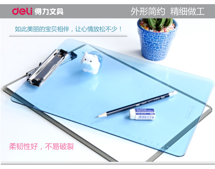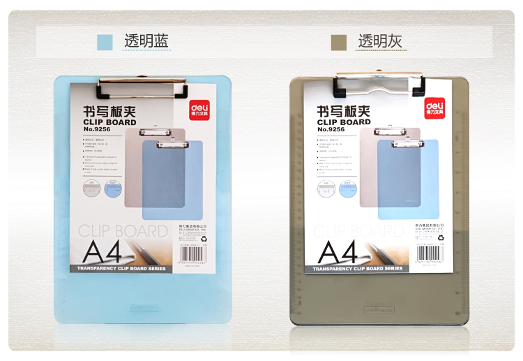 商品名称:得力-9256-透明书写板夹-透明蓝-单位:个-起订量3个