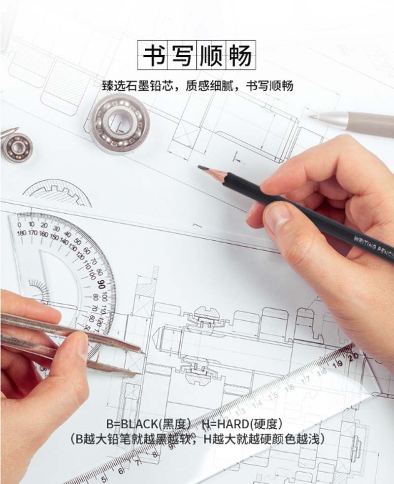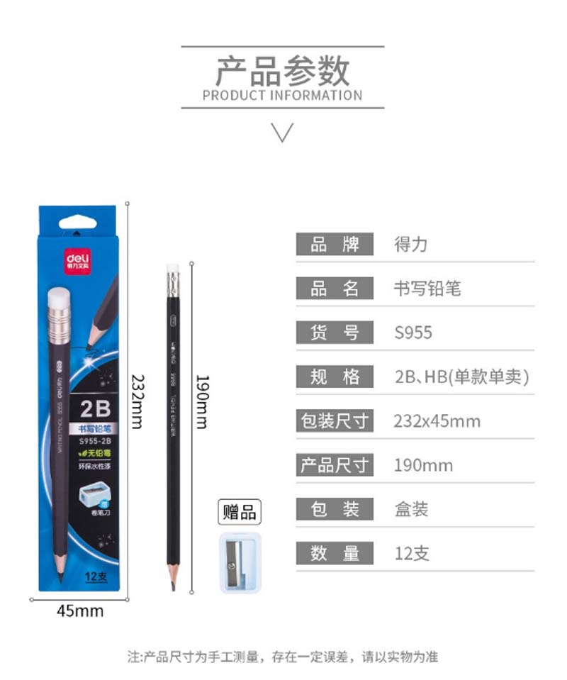 商品名称:得力 S955-2B_黑杆办公皮头2B铅笔(黑)(12支/盒)(单位:支)