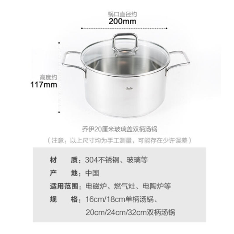 菲仕乐(Fissler)EM0511120000-Q 乔伊双耳汤锅带玻璃盖+材质:不锈钢+玻璃 规格:直径20CM 颜色:银色+计量单位:套+起订量:100(单位:个)