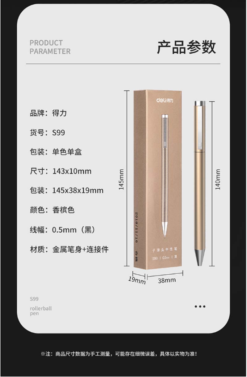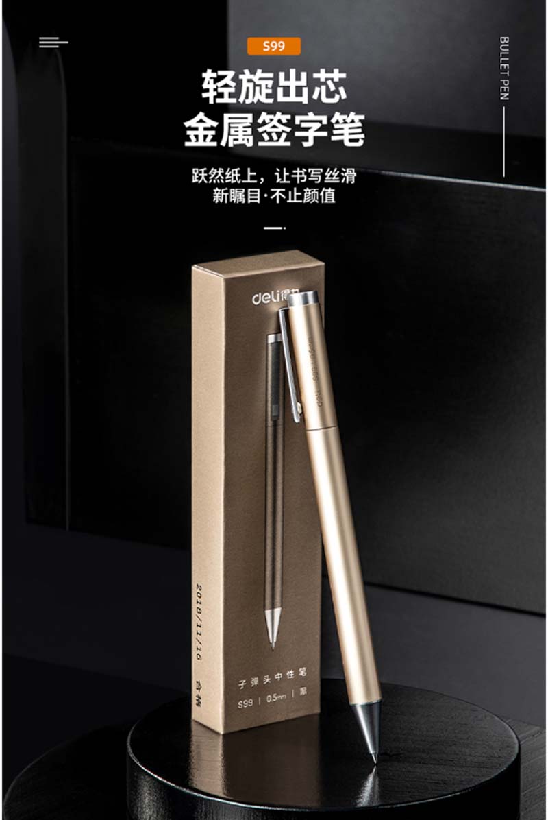 商品名称:得力-S99-中性笔-0.5mm-子弹头-(1支/盒)-(香槟金)-单位:盒-起订量3盒