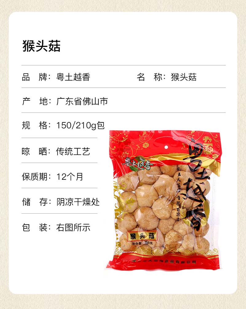 商品名称:粤土越香 猴头菇养胃暖胃猴头菌 【健康有机暖胃】210g/包(单位:包)