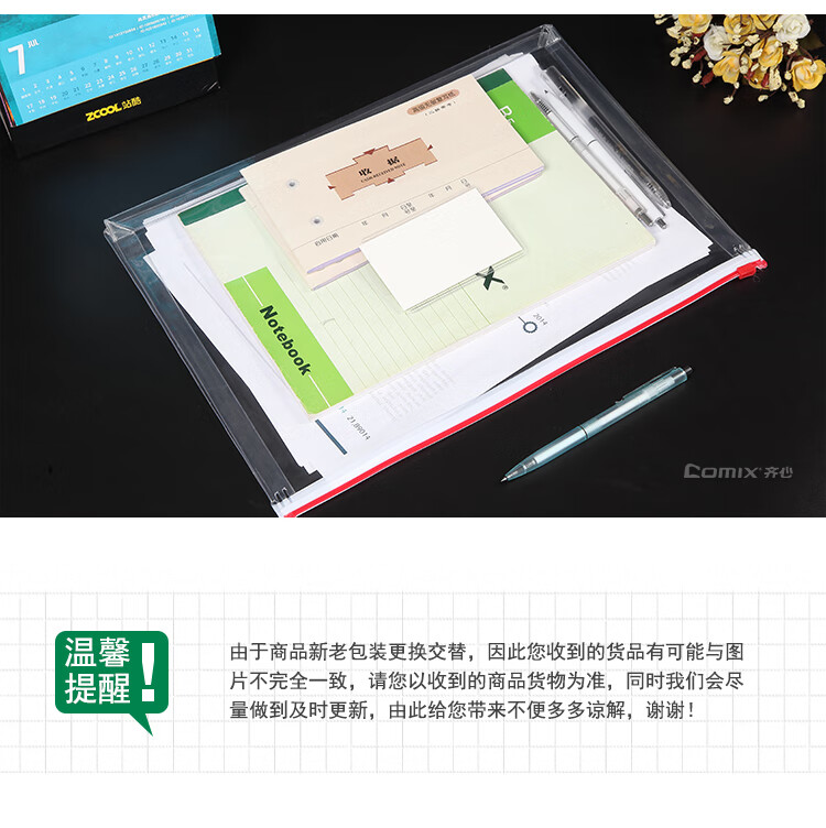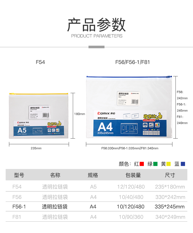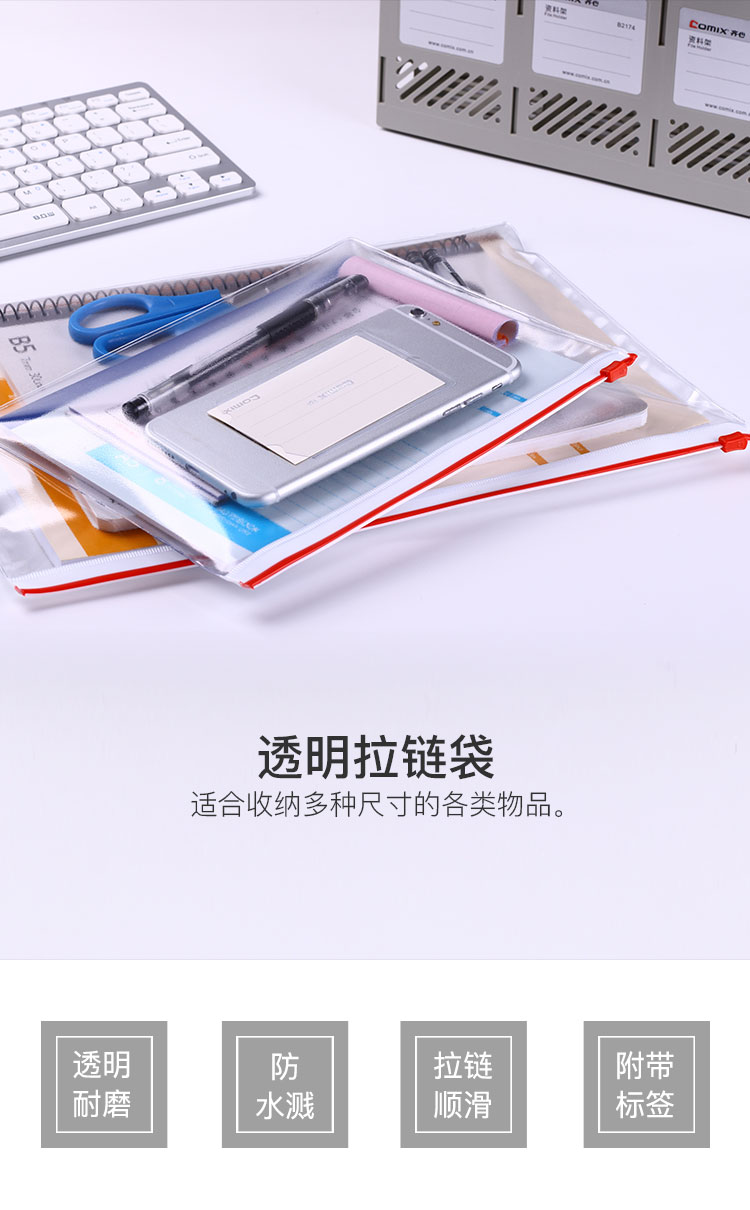 商品名称:齐心(Comix)-F56-A4文件袋PVC拉链袋-10个装-单位:包-起订量2包