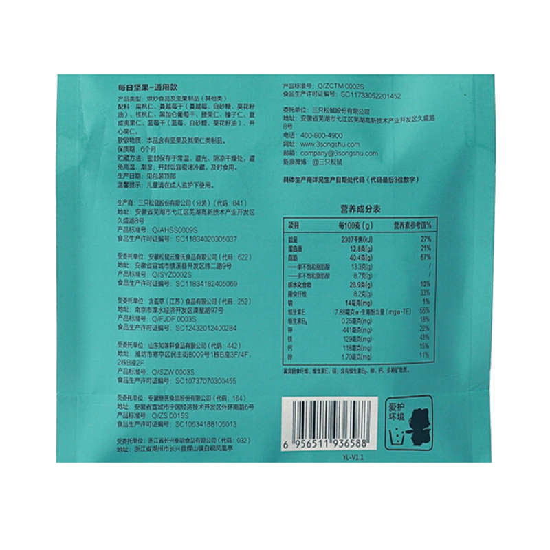 商品名称:三只松鼠 通用款每日坚果175g(袋装)*3袋 单位:袋