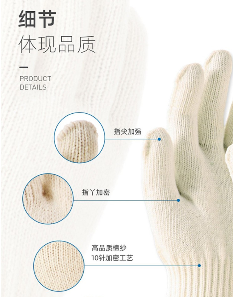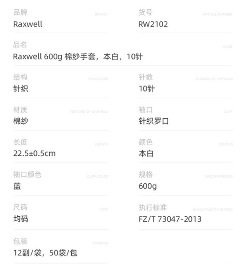 商品名称:瑞氪维尔-RW2102-棉纱手套劳保手套-10针12副/袋-本白-单位:袋