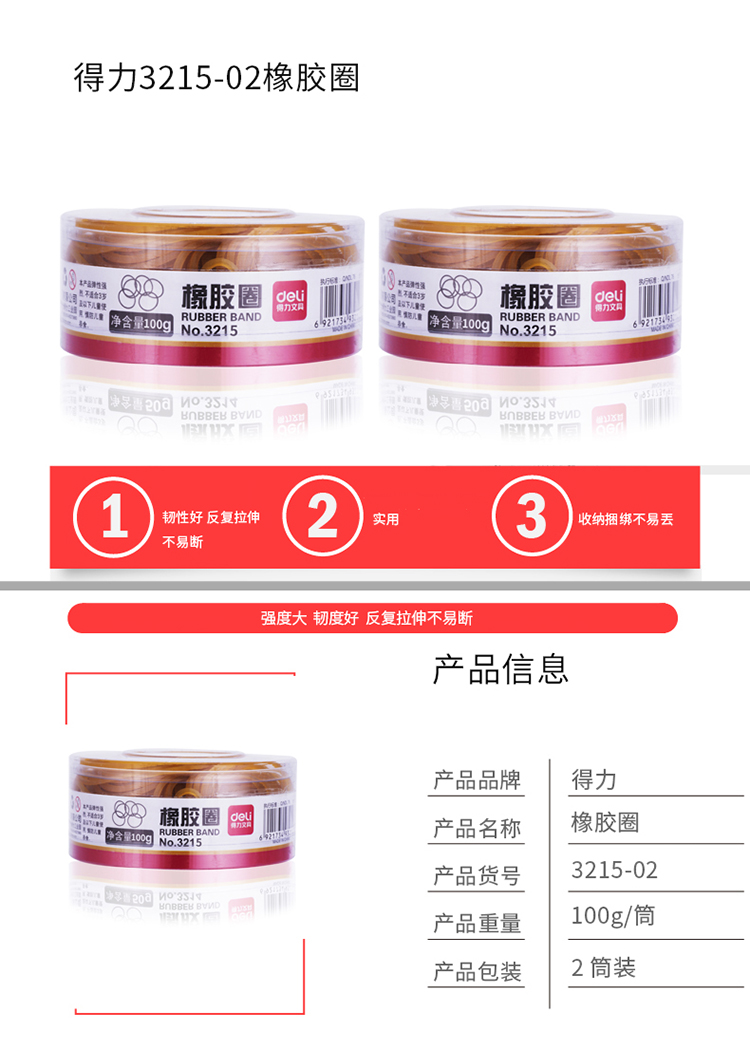 商品名称:得力 (deli)-3215-橡皮筋-100g*2-单位:筒-起订量3筒