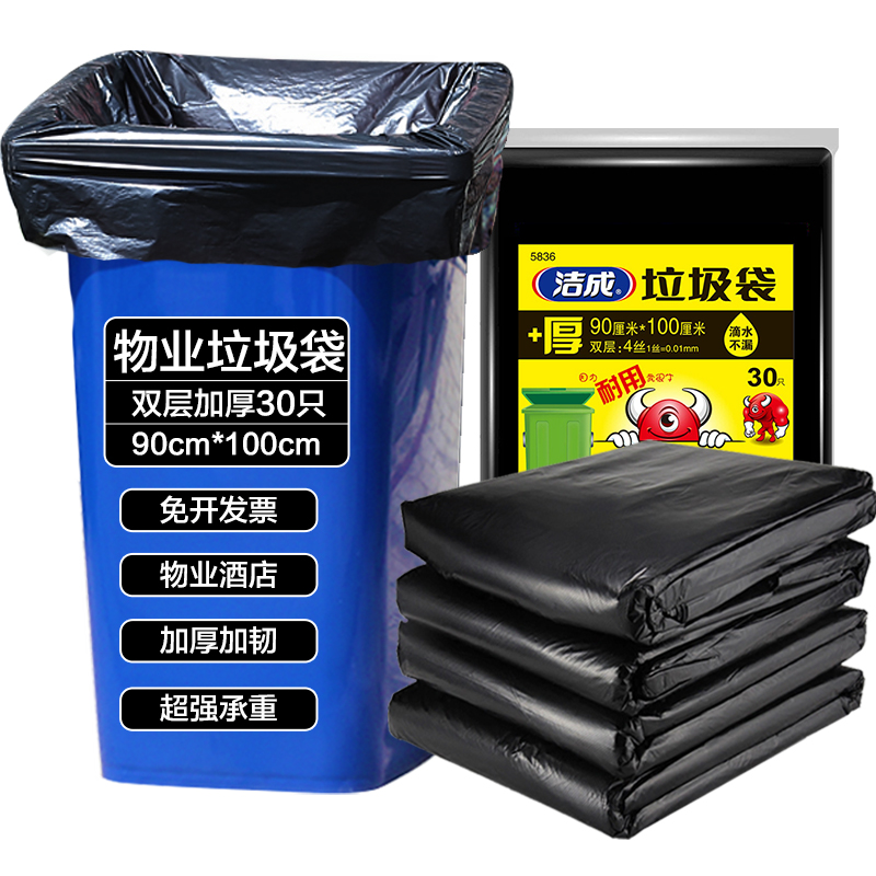 商品名称:洁成 特大号加厚黑色物业垃圾袋90cm*100cm 30只装 酒店商业家用塑料袋 单位:包