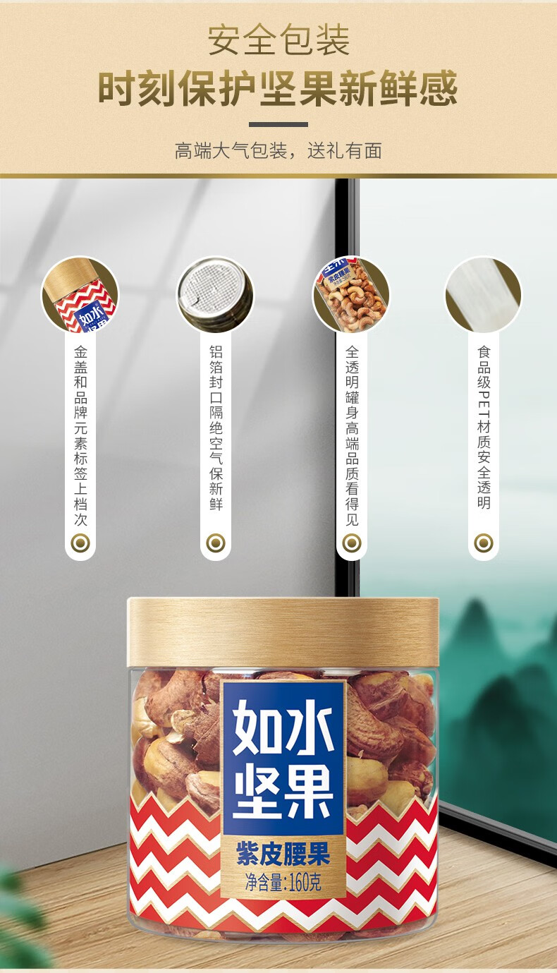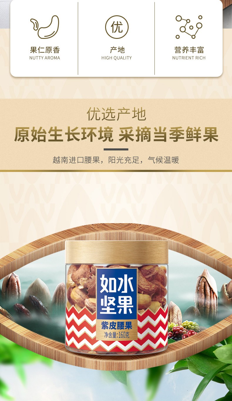 商品名称:如水紫皮腰果原味紫衣腰果带皮腰果坚果干果孕妇休闲零食 紫皮腰果160g/罐 3罐起订