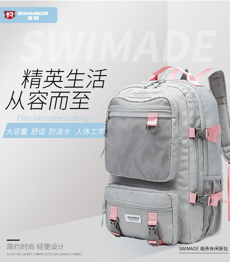 瑞制 swimade双肩包男士大容量商务旅行包电脑背包初高中大学生书包女RZ-8066 浅灰色 单位:个