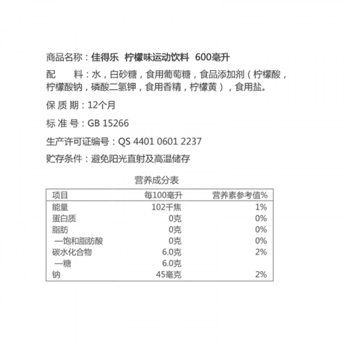 商品名称:佳得乐 柠檬味运动饮料600ml*15瓶/整箱 百事可乐出品柠檬功能饮料