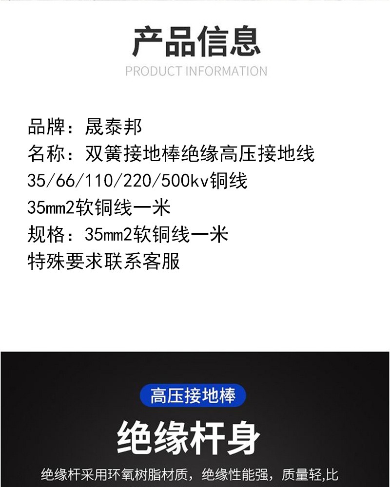 商品名称:晟泰邦双簧接地棒绝缘高压接地线35/66/110/220/500kv铜线 35mm2软铜线一米