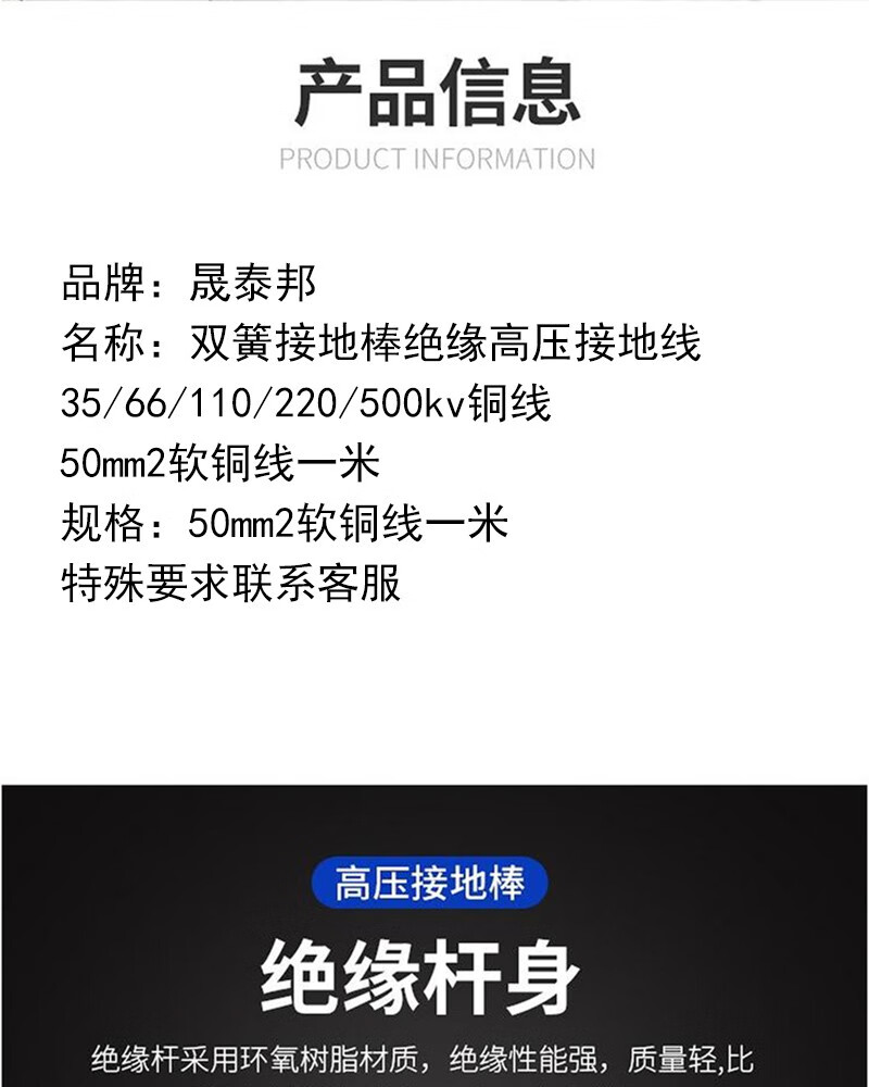 商品名称:晟泰邦双簧接地棒绝缘高压接地线35/66/110/220/500kv铜线 50mm2软铜线一米