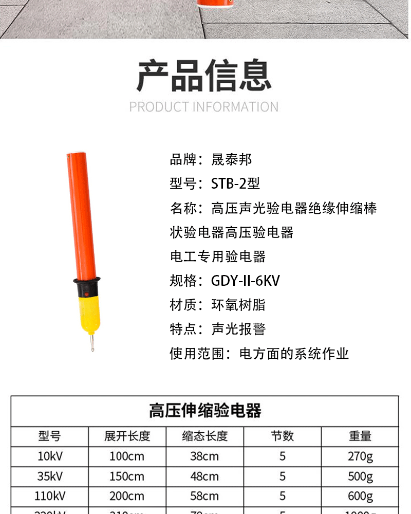 商品名称:晟泰邦 STB-2型高压声光验电器绝缘伸缩棒状验电器高压验电器 电工专用验电器 GDY-II-6KV