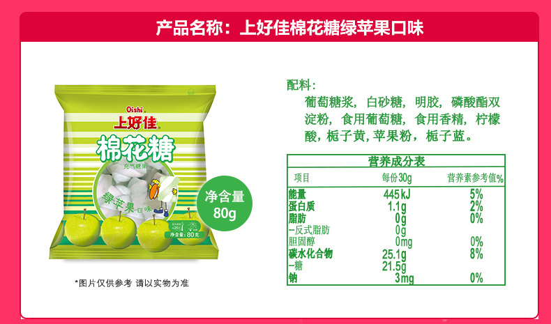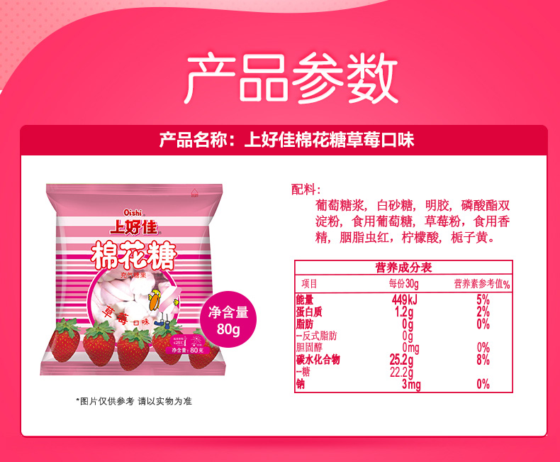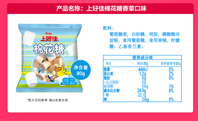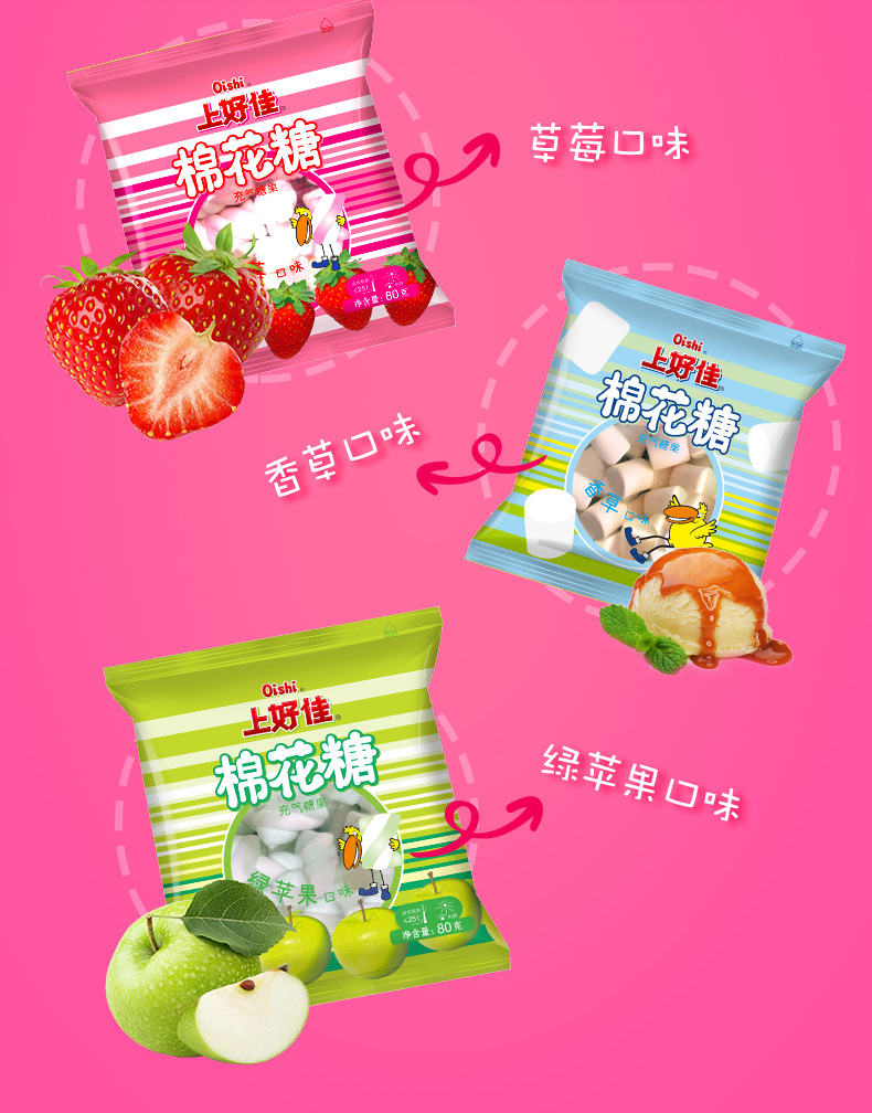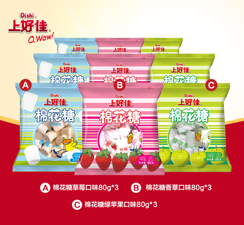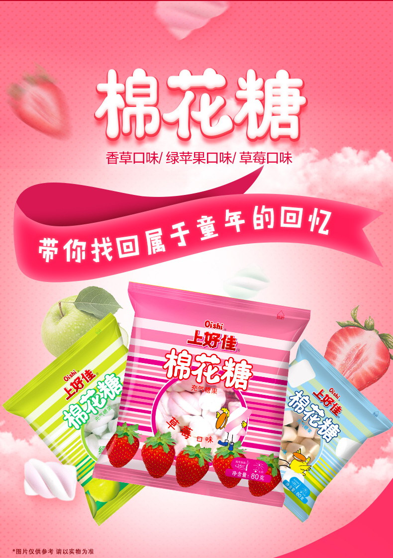 商品名称:上好佳 棉花糖80g*9袋充气软糖休闲零食香草草莓苹果口味