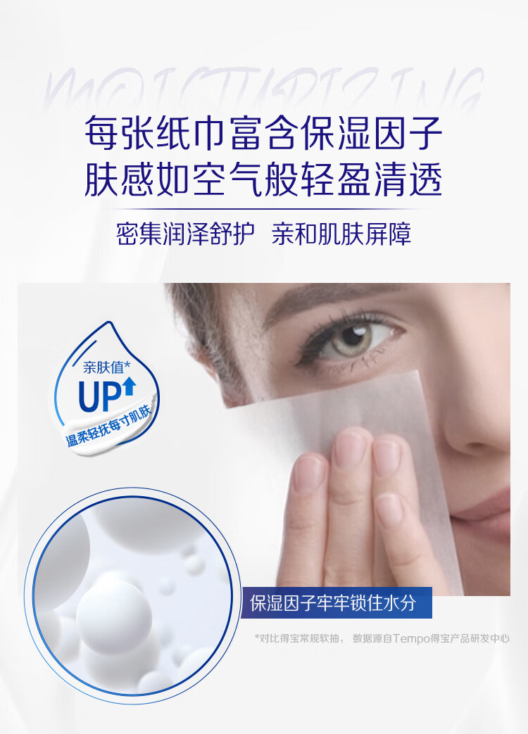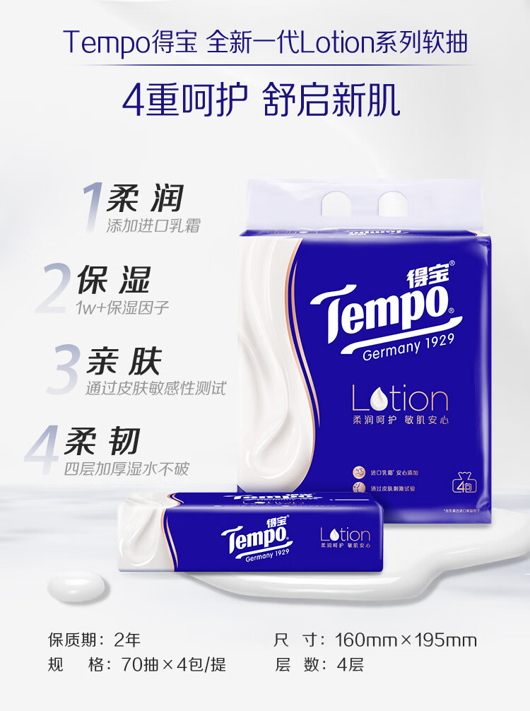 商品名称:得宝(Tempo) 抽纸Lotion高端乳霜纸保湿因子面巾纸 母婴儿 鼻敏感适用 70抽*16包(整箱销售) 单位:箱