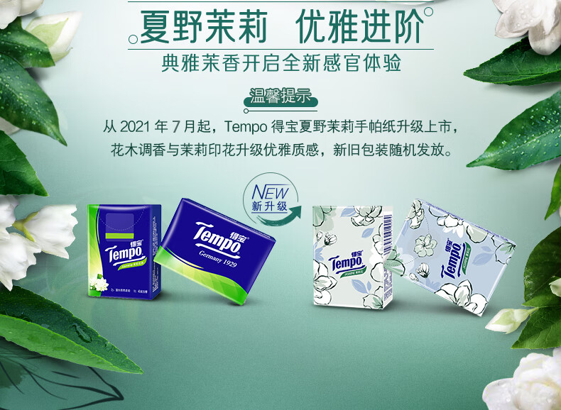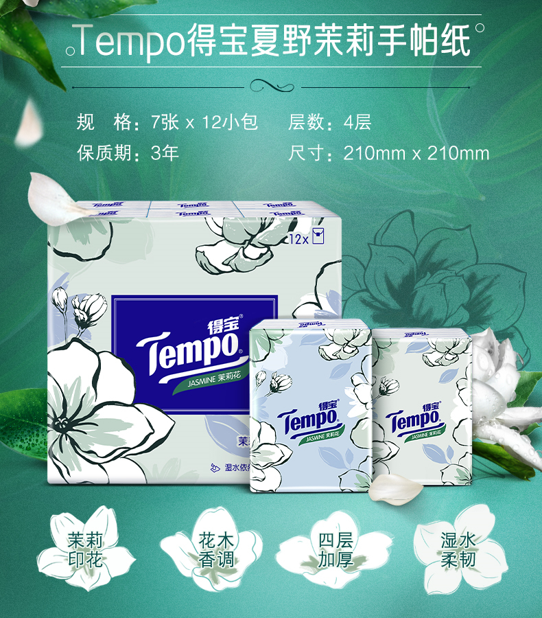 商品名称:得宝(Tempo) 手帕纸 迷你4层加厚纸巾 7张*12包 茉莉花味 单位:包