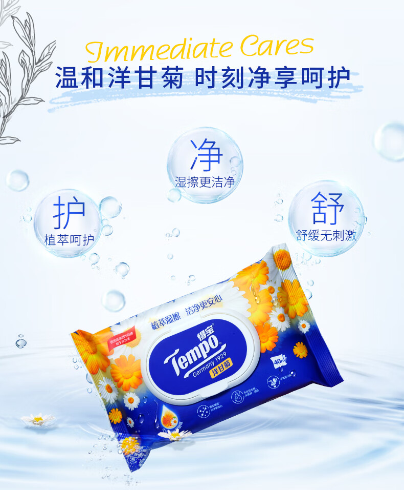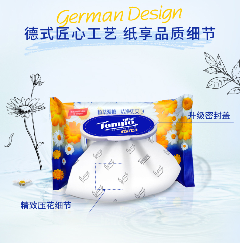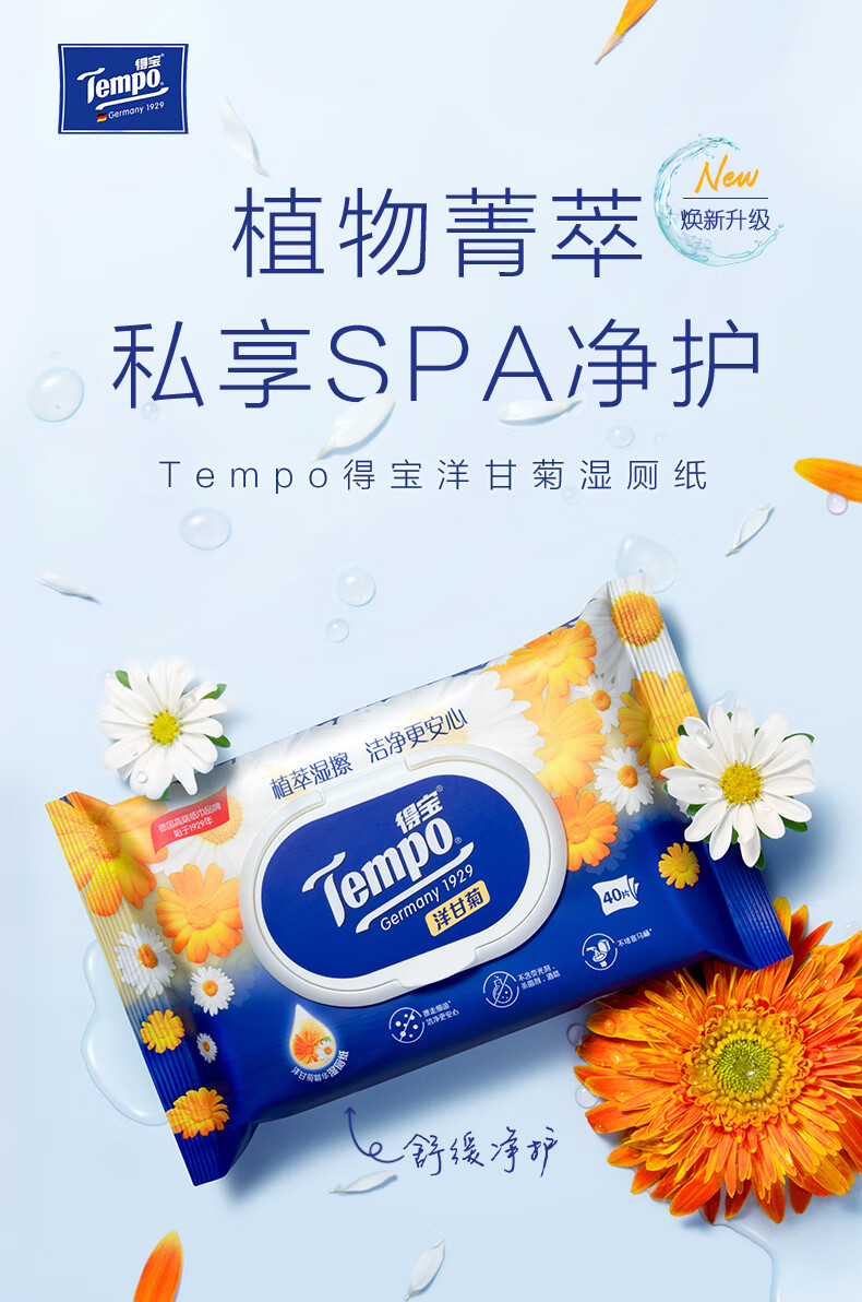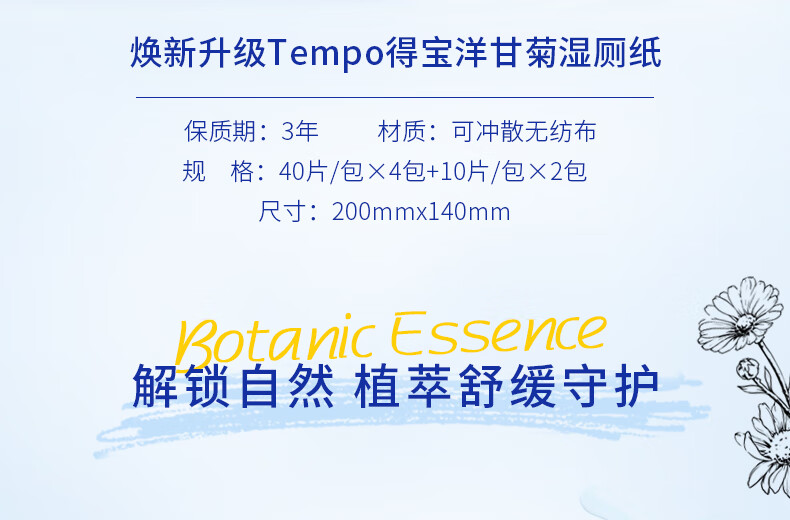 商品名称:得宝(Tempo)湿厕纸 洋甘菊植萃精华180片(40片装*4包+10片便携装*2包)干湿搭配 呵护PP