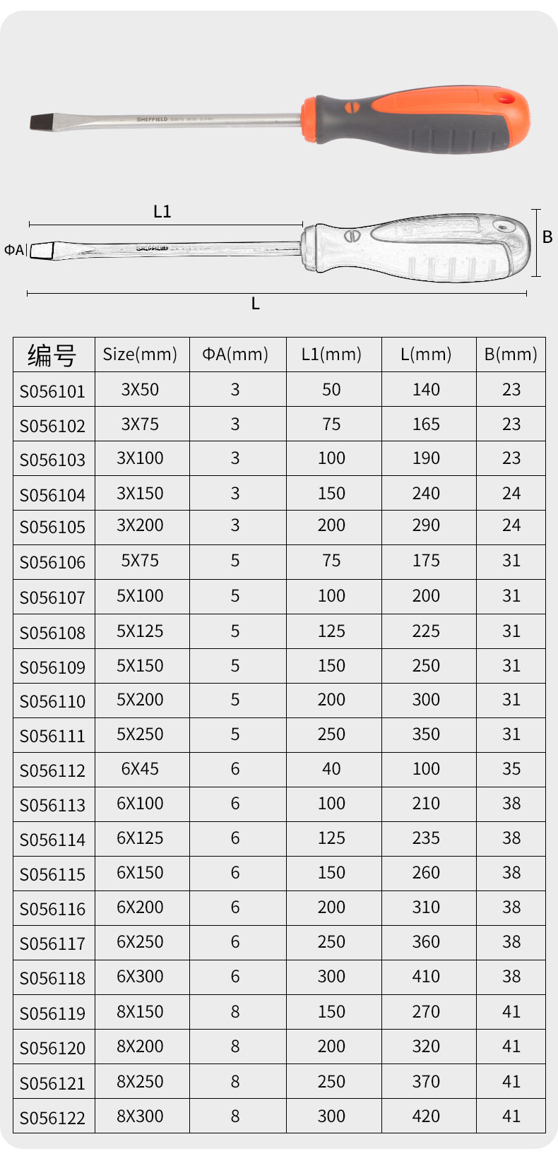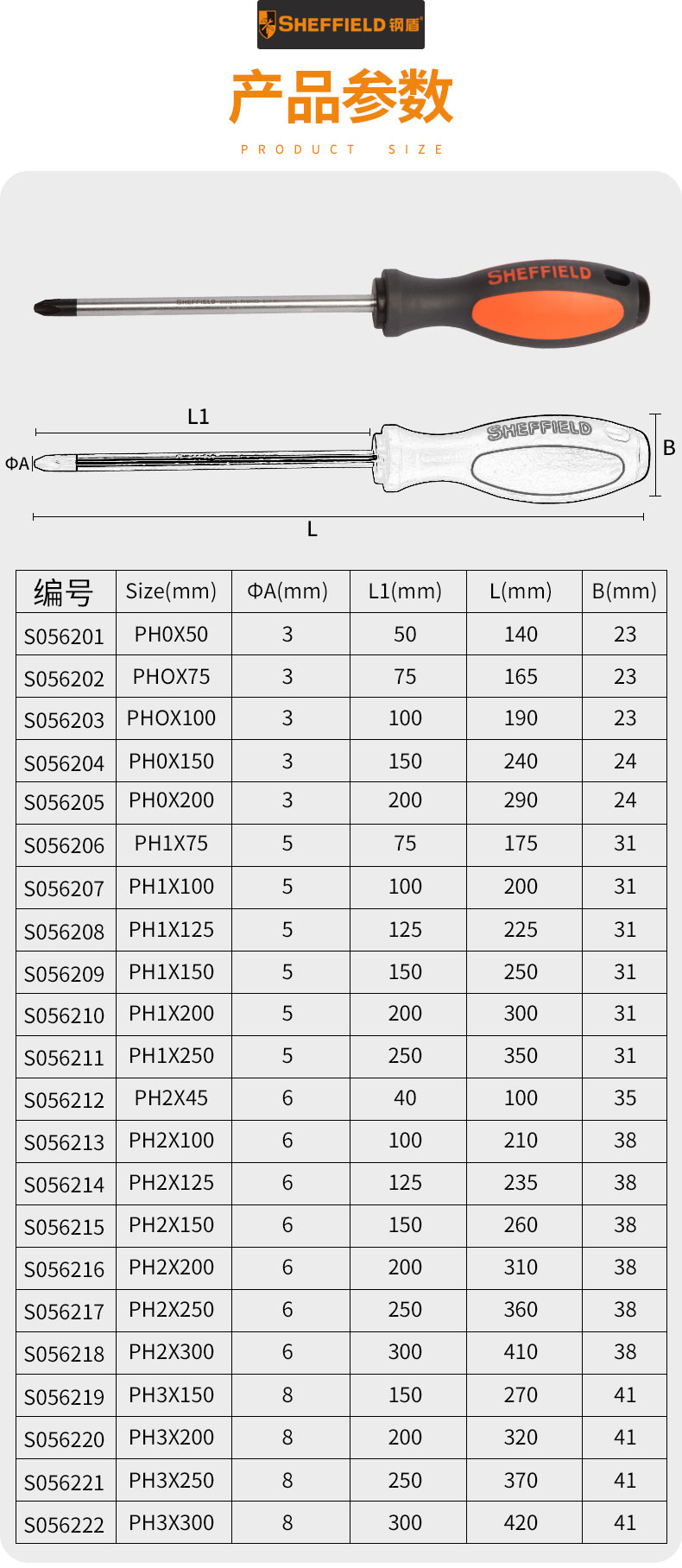 商品名称:钢盾 SHEFFIELD S056205 双色柄十字螺丝刀 PH0x200mm 10个起订