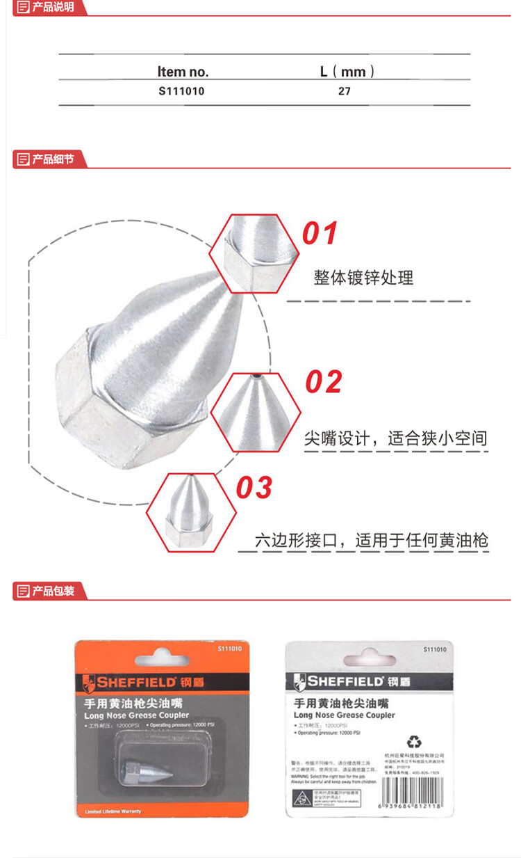 商品名称:钢盾 SHEFFIELD S111010 手用黄油枪尖油嘴 10个起订