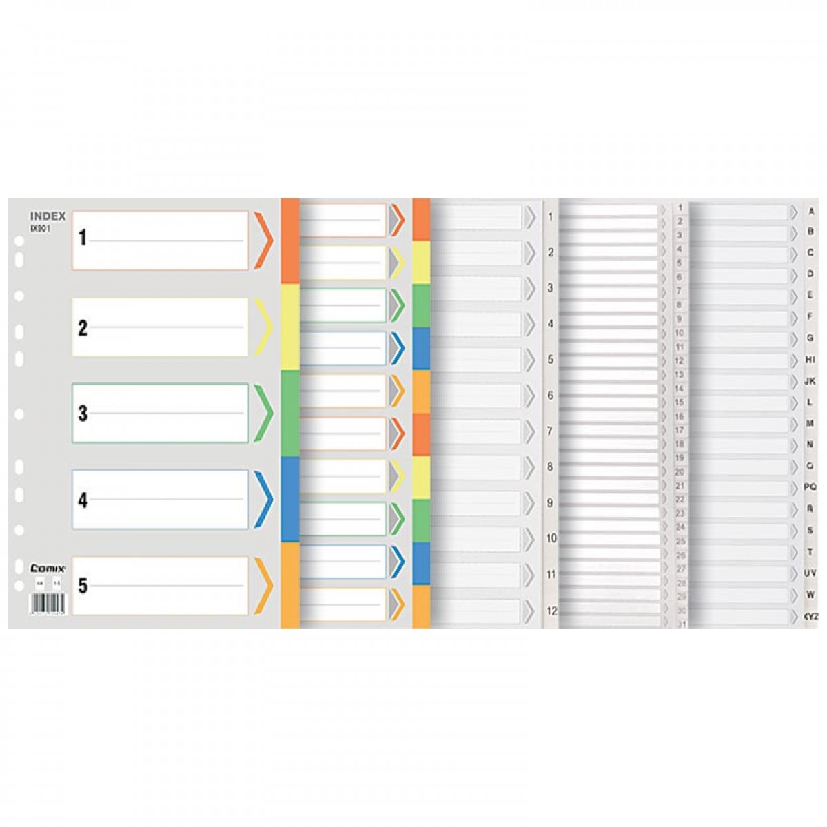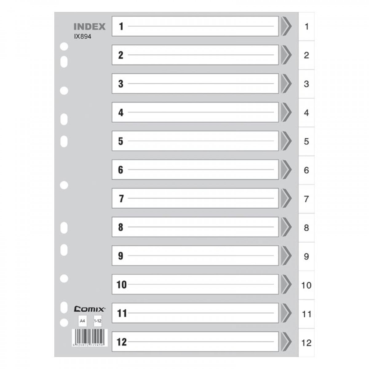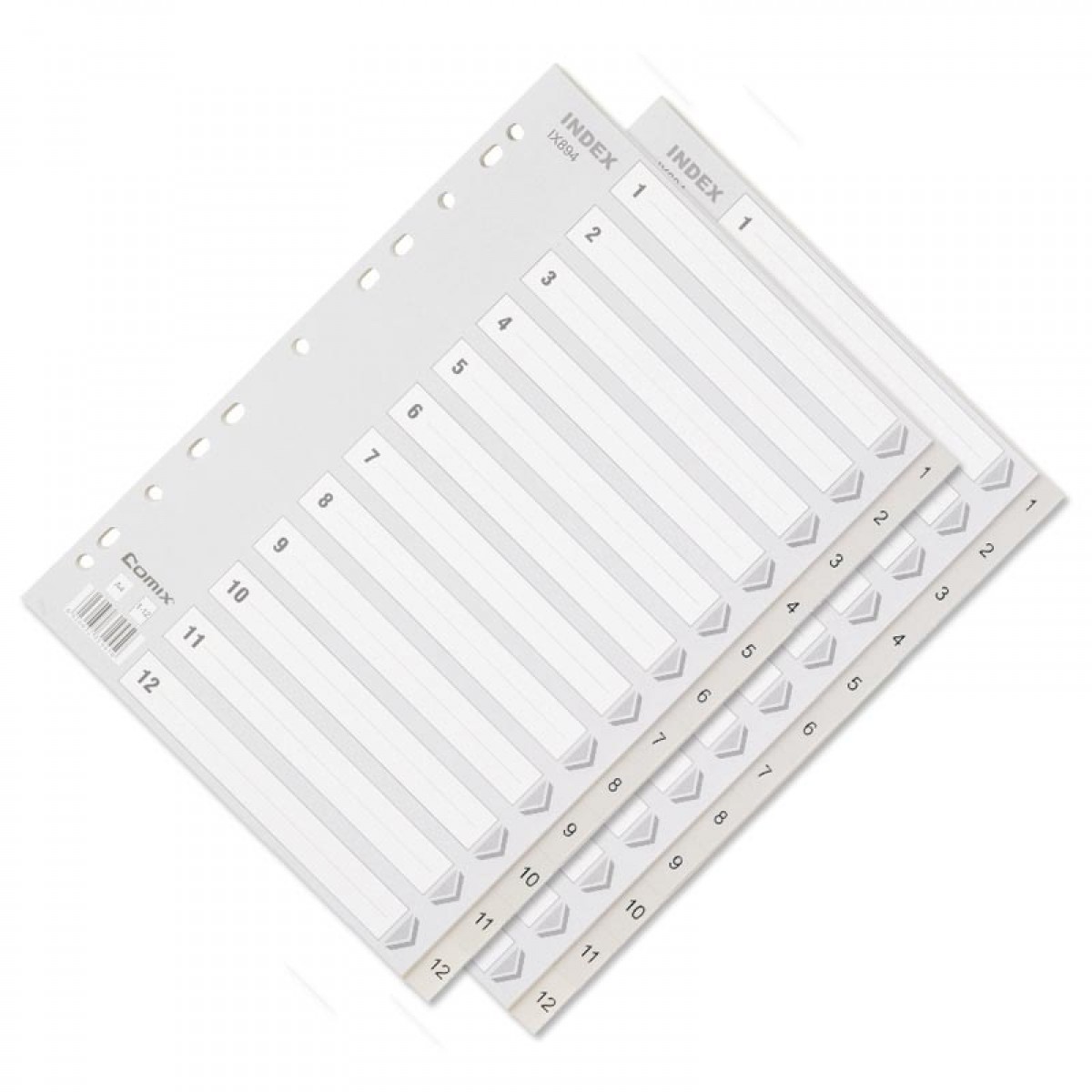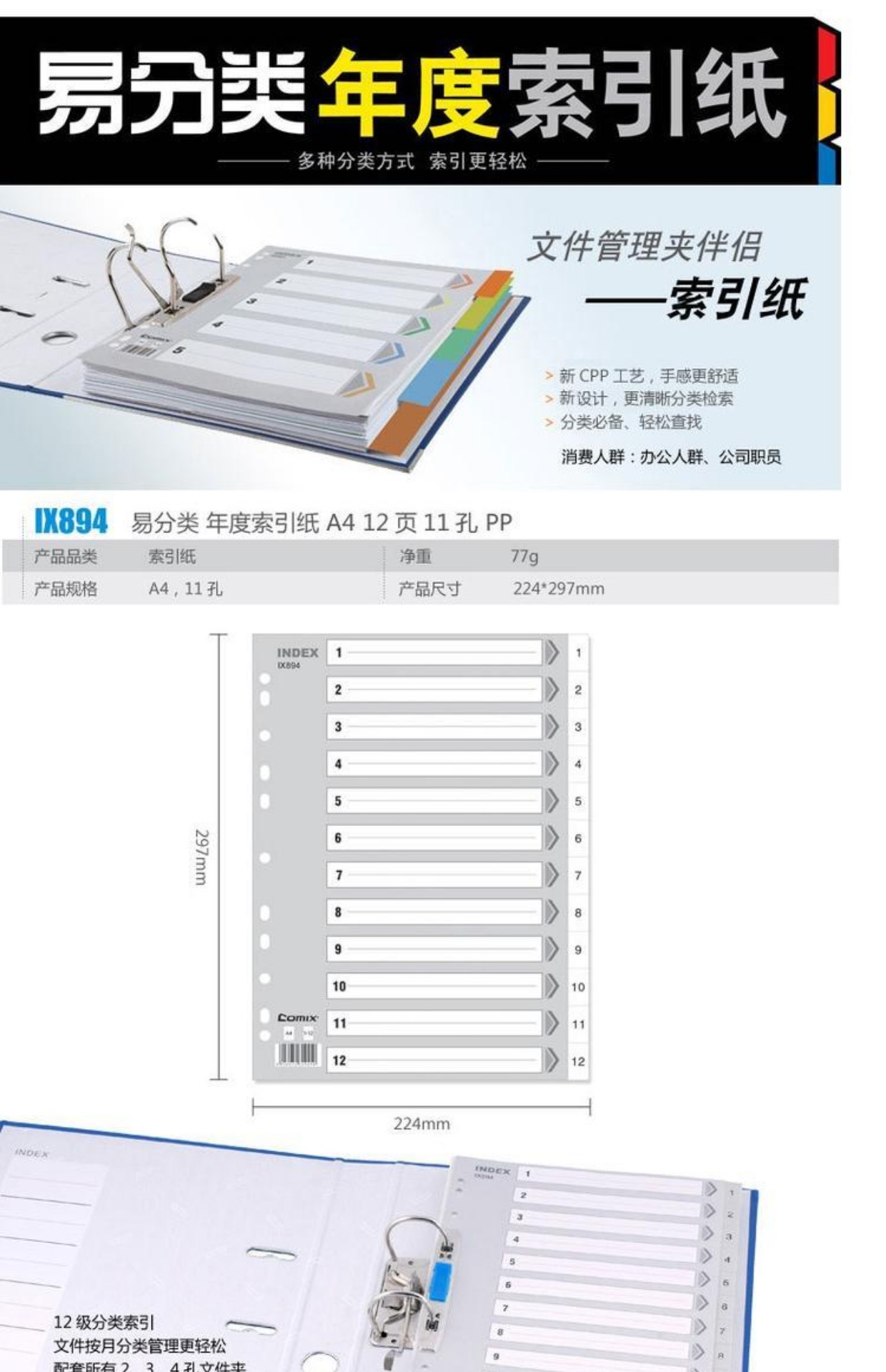 商品名称:齐心 IX894 分类纸 隔页纸 塑料年度索引纸A4数字1-12页11孔分页纸