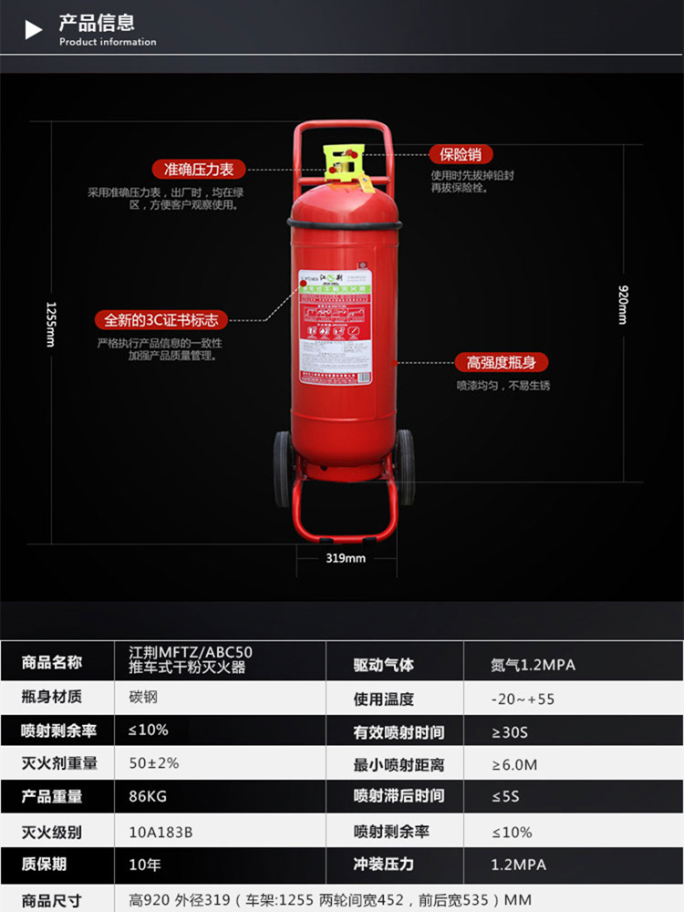 商品名称:江荆 干粉灭火器50公斤 仓库厂房用 推车式干粉灭火器MFTZ/ABC50