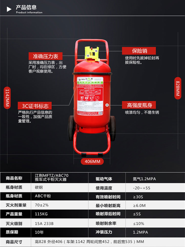 商品名称:江荆 干粉灭火器70公斤 仓库厂房用 推车式干粉灭火器MFTZ/ABC70