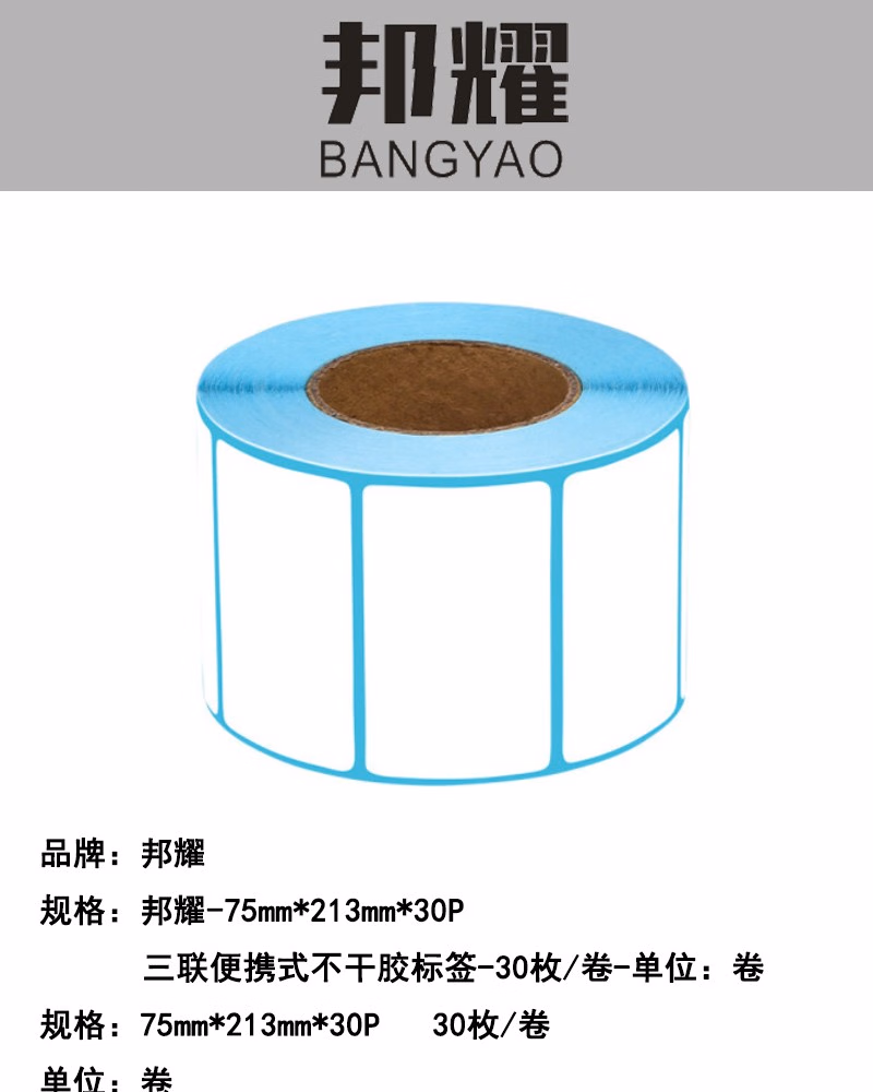 商品名称:邦耀-75mm*213mm*30P三联便携式不干胶标签-30枚/卷-单位:卷