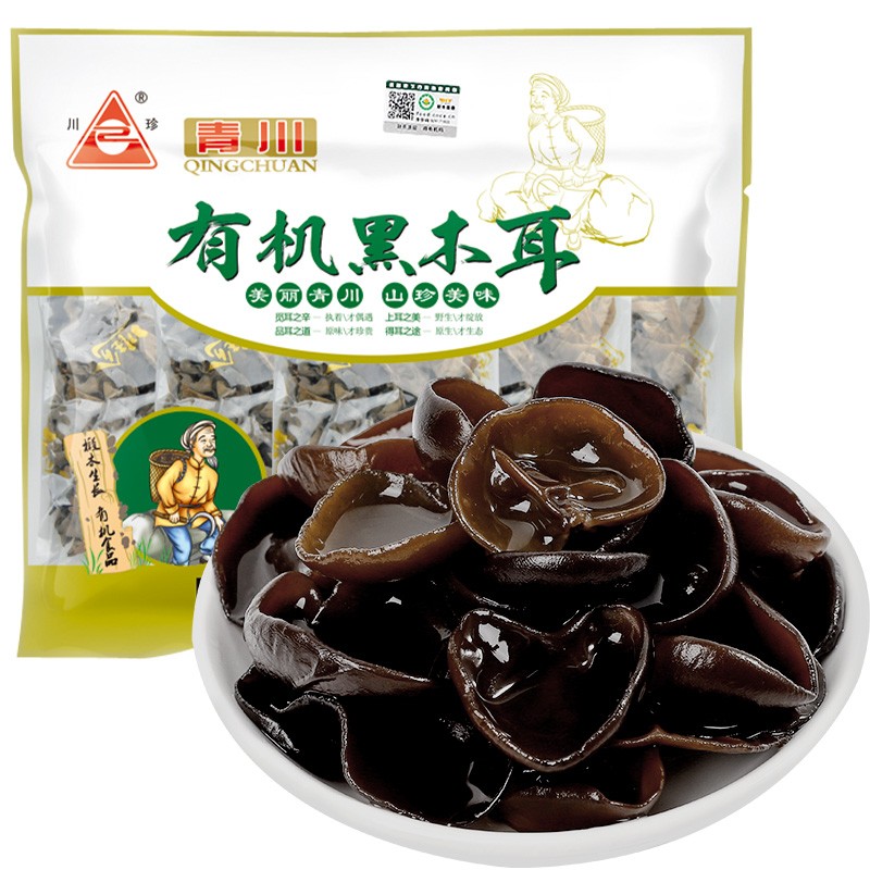 商品名称:川珍 有机黑木耳200g/袋 肉厚无根小碗耳 炒菜凉拌火锅食材煲汤材料 青川特产山珍南北干货 单位:袋
