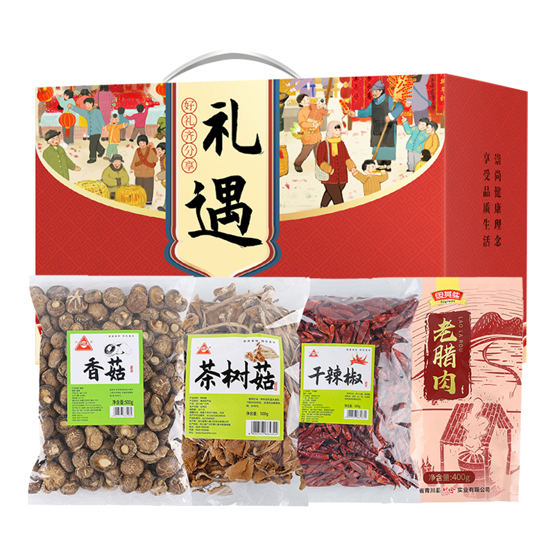 商品名称:川珍 香菇茶树菇腊肉干辣椒组合礼遇礼盒 1900g/盒 四川特产老腊肉 山珍菌菇煲汤食材