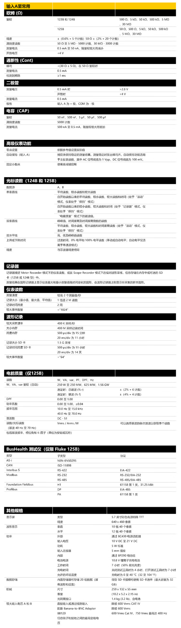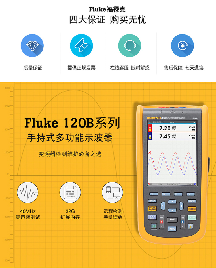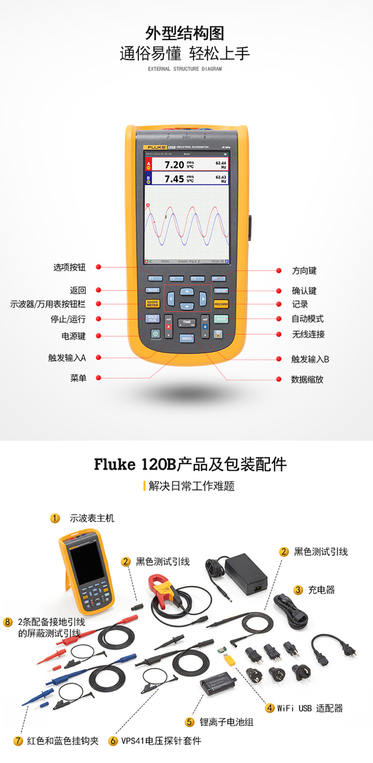 商品名称:福禄克(FLUKE) 124B/CN 工业用手持式示波表 40M带宽/双通道 FLUKE 124B/CN