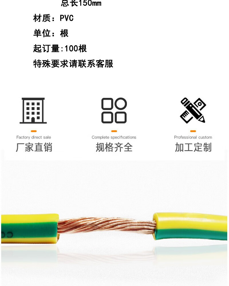 商品名称:晟泰邦 无氧铜黄绿双色接地线6 10平方铜芯 桥架接地线跨接线1.5平方 带护套 总长120mm 起订量100根 单位:根