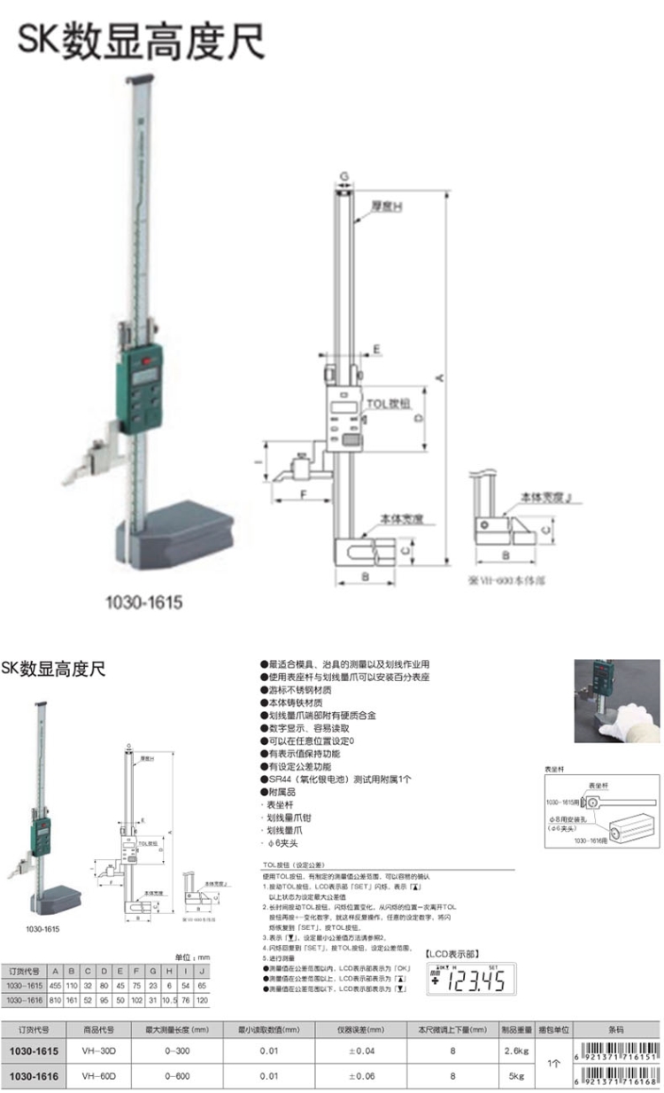 商品名称:田岛(TAJIMA)VH-30D SK数显高度尺0-300 1030-1615