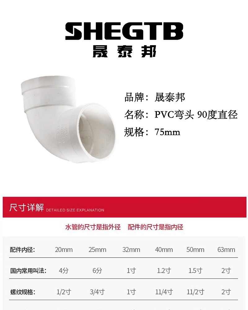 商品名称:晟泰邦 PVC弯头 90度直径75mm 单位:个