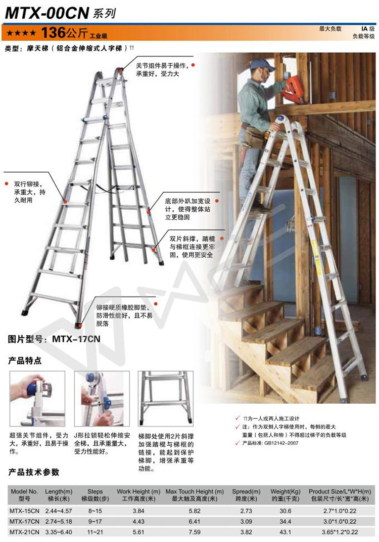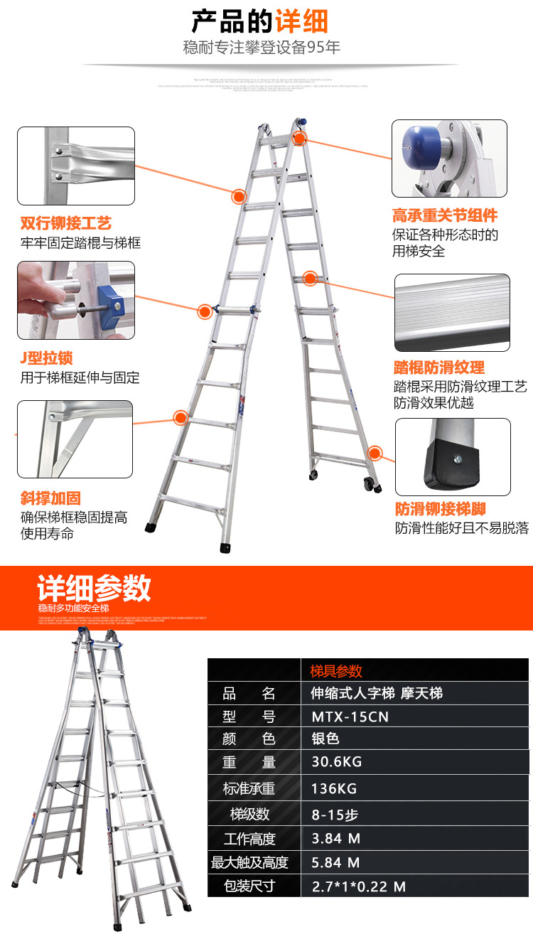 商品名称:稳耐15步铝合金可伸缩摩天梯 梯长4.5米型号MTX-15CN 承重136kg