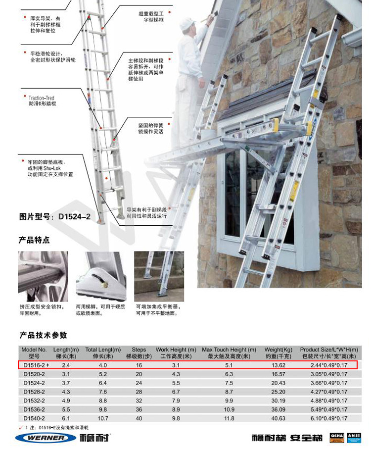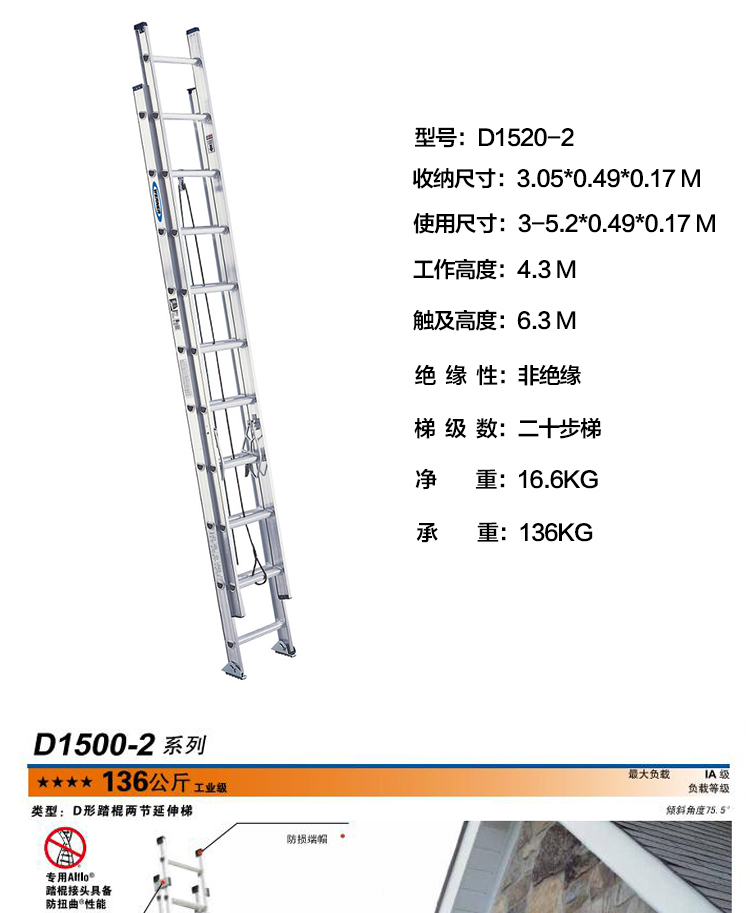 商品名称:稳耐20步铝合金两节延伸梯 伸长5.18m 型号D1520-2 承重136kg