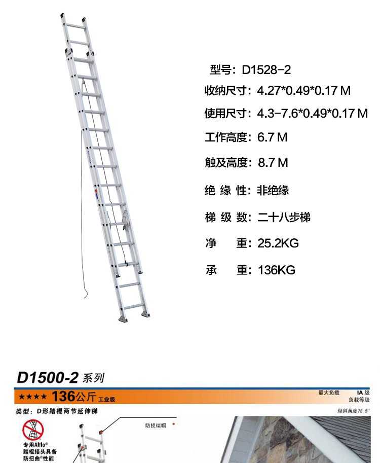 商品名称:稳耐28步铝合金两节延伸梯 伸长7.62m 型号D1528-2 承重136kg