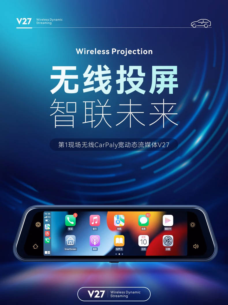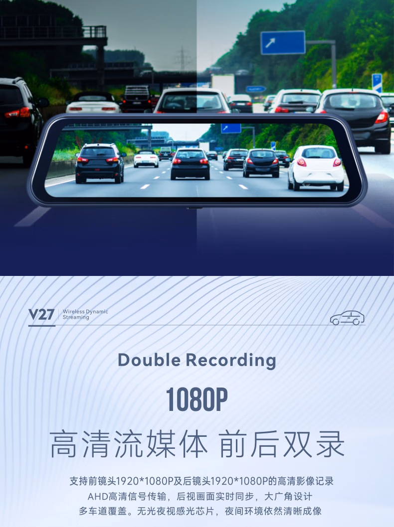 第一现场无线投屏车载智能流媒体行车记录仪V27,前后1080P高清双录,24小时停车监控,语音交互 官方标配+64G内存卡