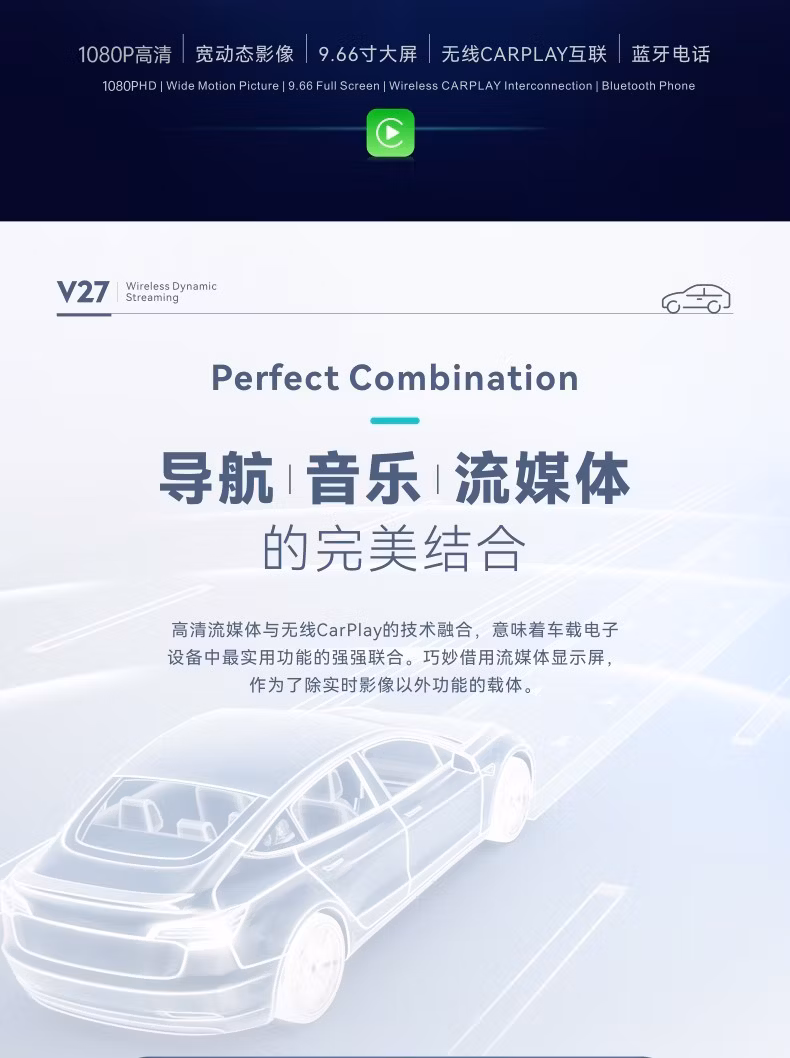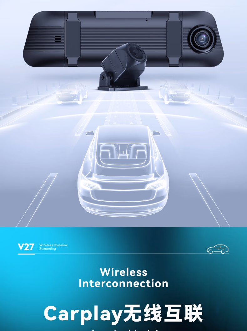 商品名称:第一现场无线投屏车载智能流媒体行车记录仪V27,前后1080P高清双录,24小时停车监控,语音交互 官方标配+64G内存卡