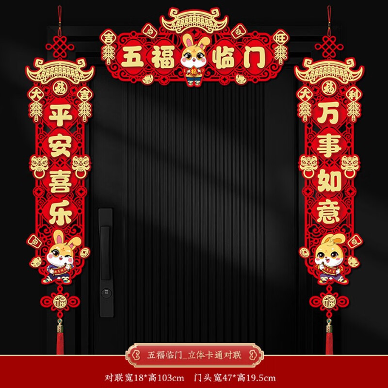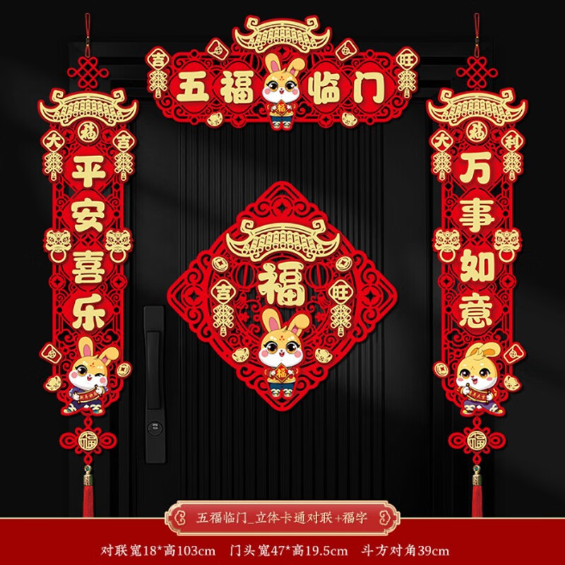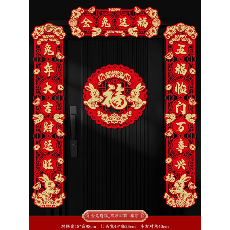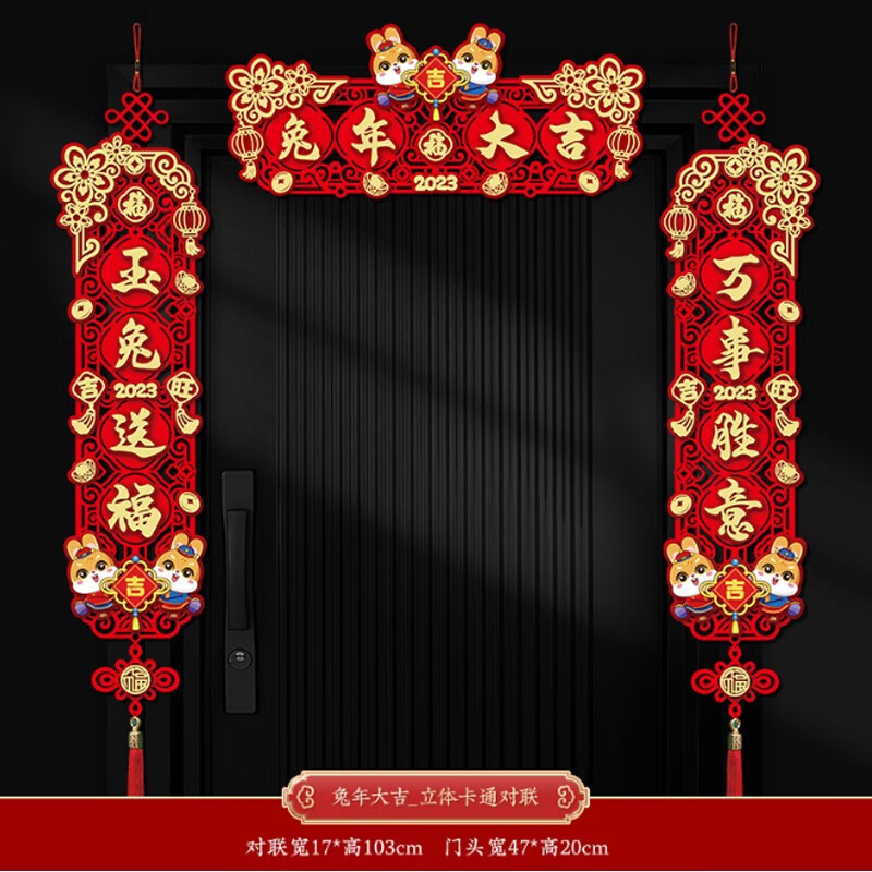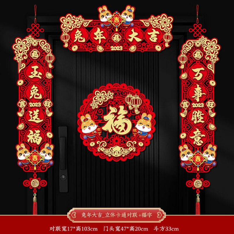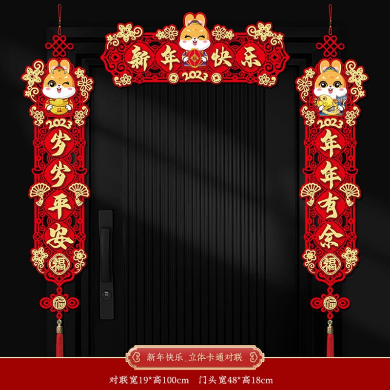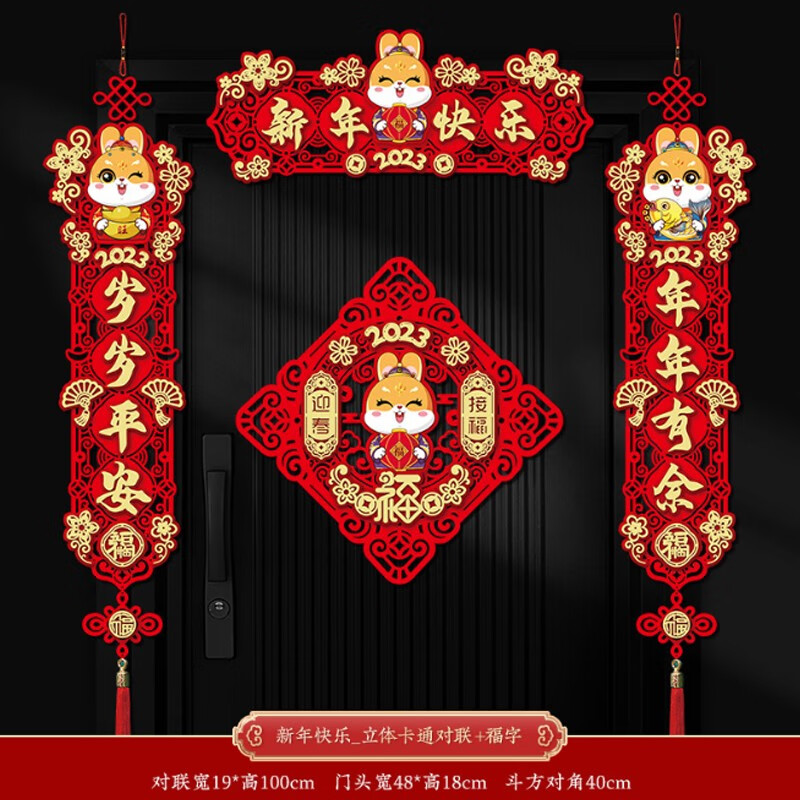 晟泰邦 新年对联兔年春联立体卡通大门挥春过年装饰春节门贴 新年快乐_卡通对联+福字