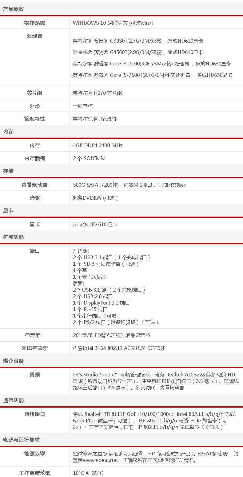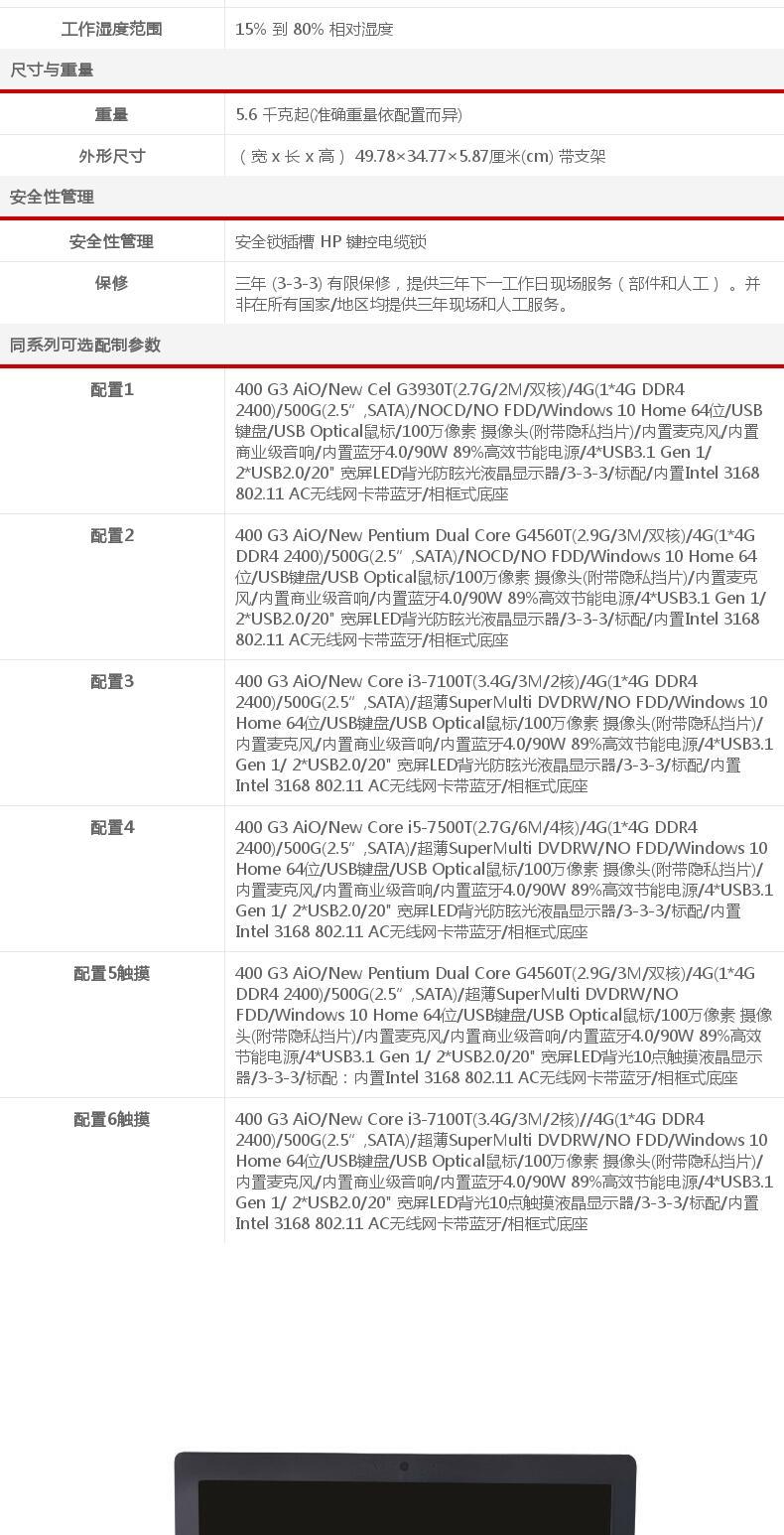 商品名称:惠普/HP ProOne 400 G3 AiO G2 20英寸商用一体机电脑赛扬/i3/i5