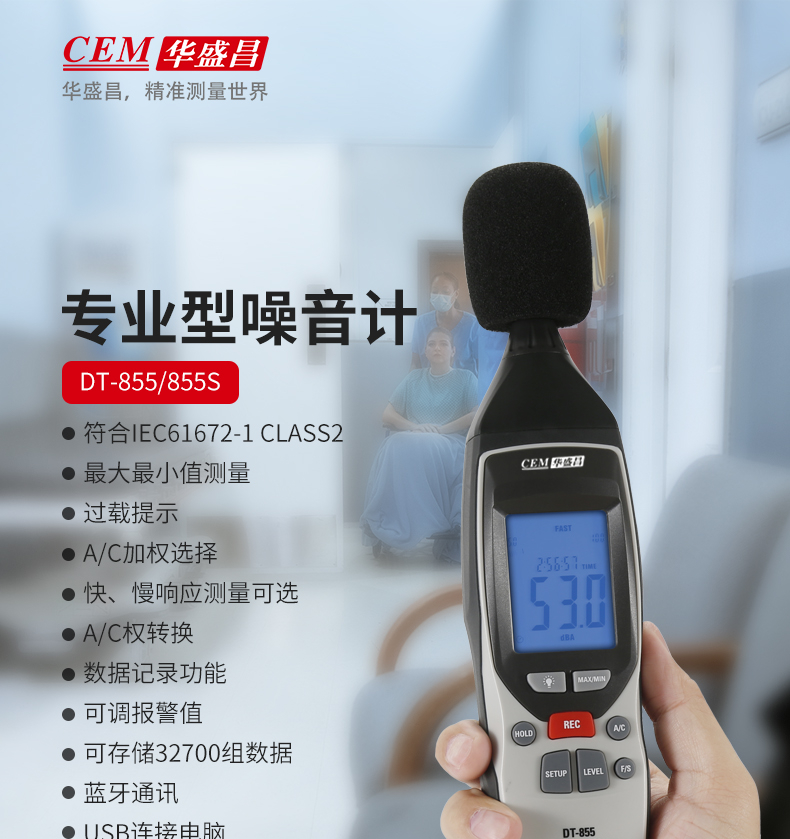 华盛昌(CEM)DT-855数字噪音计 高精度分贝仪手持式噪声噪音测试仪环境音量测量仪 单位:台