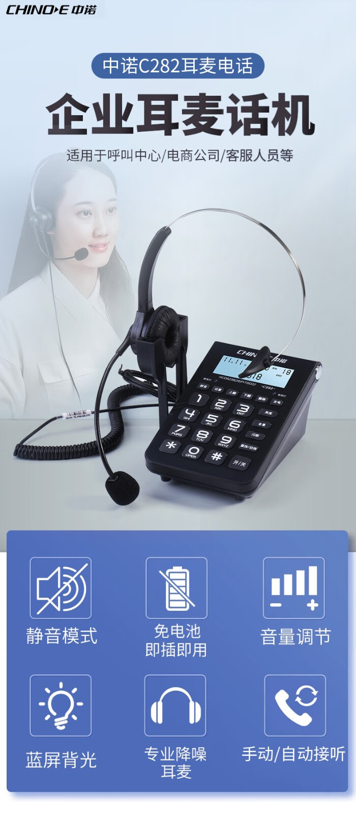 商品名称:中诺(CHINO-E) 中诺呼叫中心坐席客服话务员耳麦电话机固定座机耳机头戴式C282 耳麦电话套装 单位:台